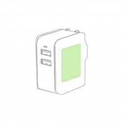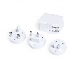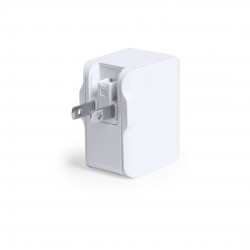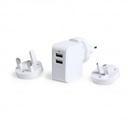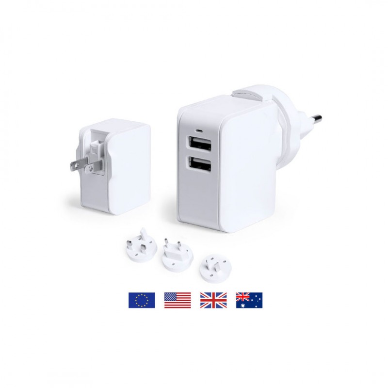 De elegante diseño en color blanco y amplia superficie de marcaje. 2 salidas USB de 2.400 mA, con LEDs indicadores y adaptadores de enchufe de pared para USA, Europa, Asia, Reino Unido y Australia.