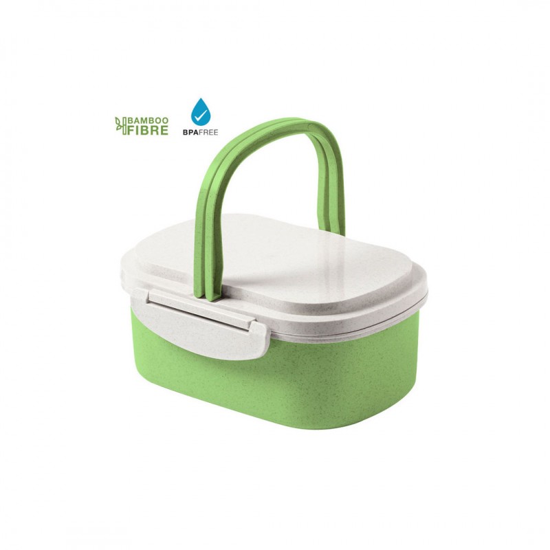 En fibra de bambú y en diseño bicolor. Incluye 2 compartimentos interiores, tapa hermética con cierres de seguridad laterales y cómoda asa de transporte.
