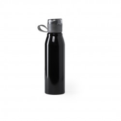 En aluminio de acabado brillante, con tapón a juego, dosificador libre de BPA y asa de transporte.