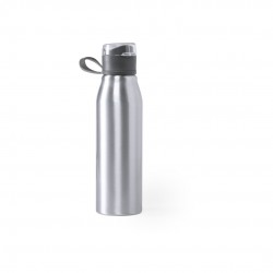 En aluminio de acabado brillante, con tapón a juego, dosificador libre de BPA y asa de transporte.