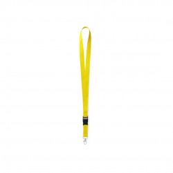 Lanyard en resistente poliéster con hebilla multifunción y gancho metálico.