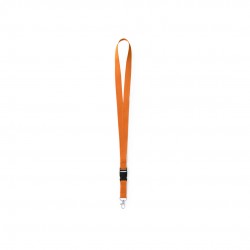 Lanyard en resistente poliéster con hebilla multifunción y gancho metálico.